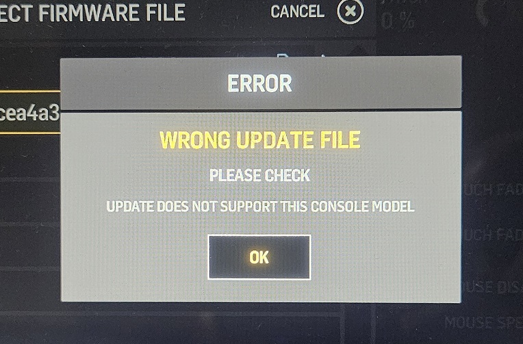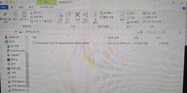 3-2-1. 해당 WING본체의 낮은 버전 펌웨어를 가지고 있다면 USB드라이브의 루트에 그 펌웨어 하나만 넣고 WING 본체의 SETUP 메뉴에서 UPDATE 시도