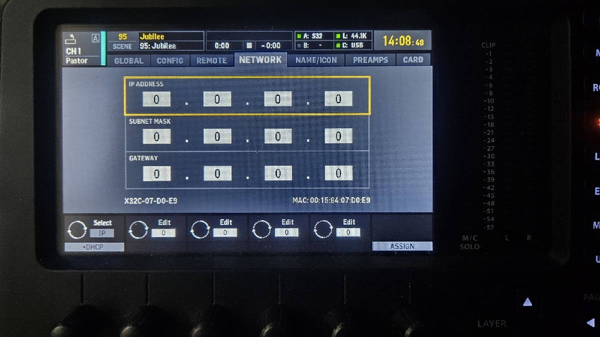 * DHCP가 켜져 있고 자동IP라 하더라도 X32-Edit나 X32-Mix 연결이 안되는 것은 아닙니다. 공유기로부터 정상적으로 IP를 자동으로 할당 받았다면 위 이미지와 달리 IP ADRESS 부분에 할당받은 IP가 자동으로 채워져 있으니 X32-Edit나 X32-Mix에서 그 IP주소를 입력하면 연동하여 컨트롤 가능합니다.