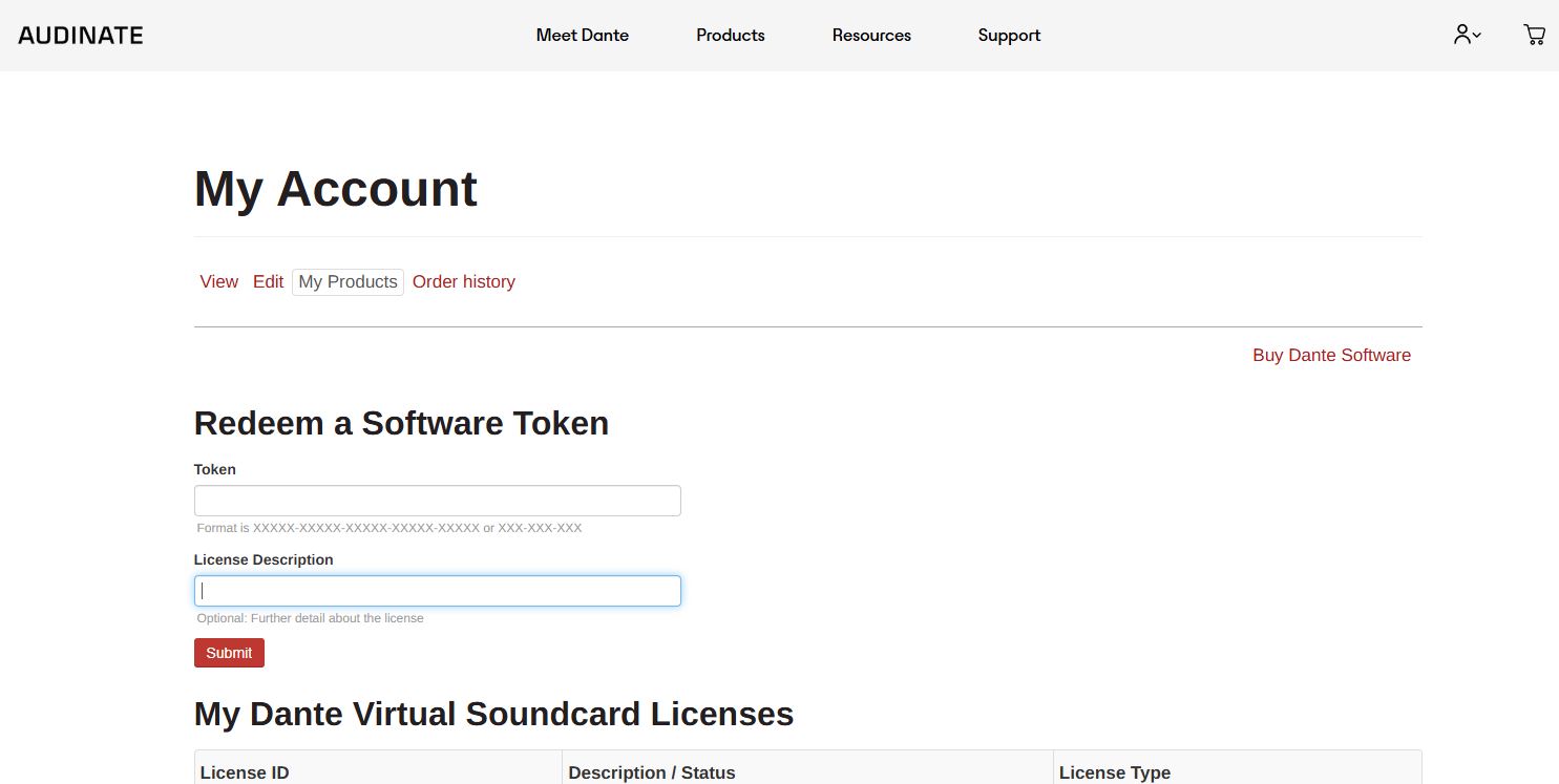 3. Audinate 공식 Getdante 사이트에 회원가입 후 My Account에서 Redeem Software Token에 토큰과 장비설명 넣고 Submit 하면 등록 끝