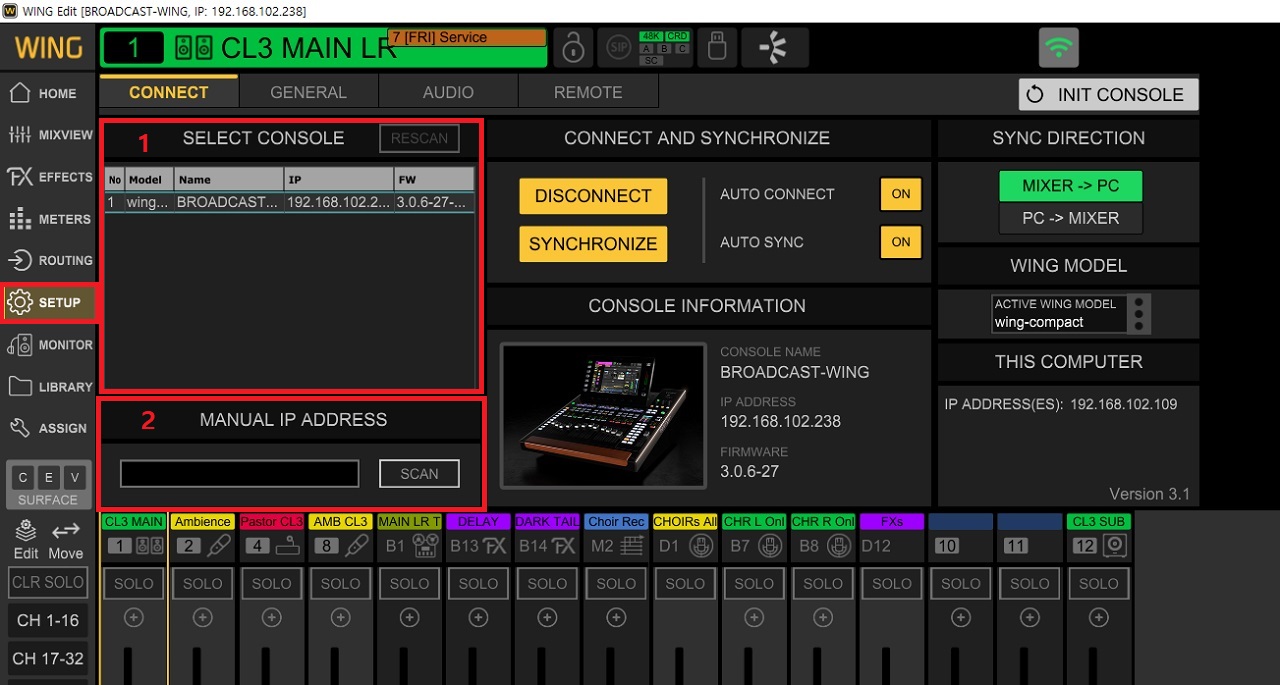 위 이미지를 참고하여 WING Edit에서 SETUP 메뉴를 클릭하면 WING 콘솔 자체의 SETUP메뉴 구성과 다르게 CONNECT라는 메뉴가 더 있습니다.