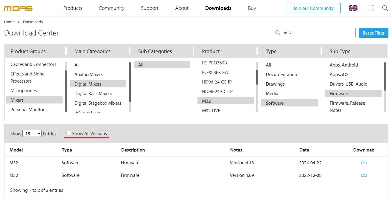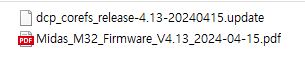 - 마이다스 공식 홈페이지 다운로드 페이지에서 원하는 버전의 펌웨어(업데이트할 펌웨어 + 응급조치시 롤백할 현재 버전의 펌웨어)를 다운로드 받습니다.