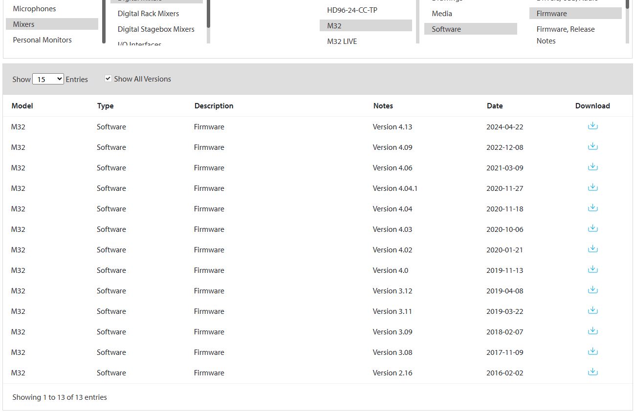 - M32, M32R은 펌웨어업데이트 후 위2와 같은 문제가 발생할 경우 긴급 업(?)데이트 (Emergency Update)를 통해 낮은 버전의 펌웨어를 다시 설치할 수 있도록 되어있으니 콘솔의 펌웨어 버전을 확인하시고 아래 펌웨어 업데이트 준비물을 참고하셔서 제조사의 홈페이지(https://www.midasconsoles.com/downloads.html)에서 미리 다운로드 받아두세요